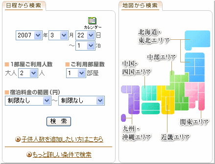 ②場所で検索する場合・・・画面の右の地図上のエリアをクリックします。選択した箇所の県名が表示されるので旅行先を選んでいきだけです。